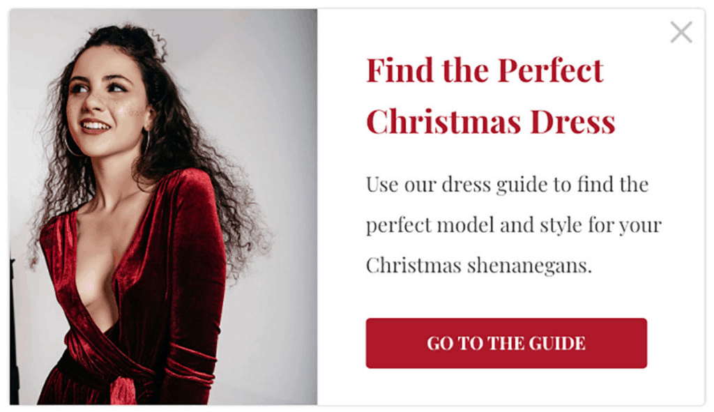 For example, if you have an apparel site, you can use the pop-ups to guide your visitors to buy the perfect dress for Christmas or New Year.