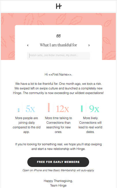 Hinge used email marketing for approaching their customers. They send emails asking the question of what you are thankful for?
